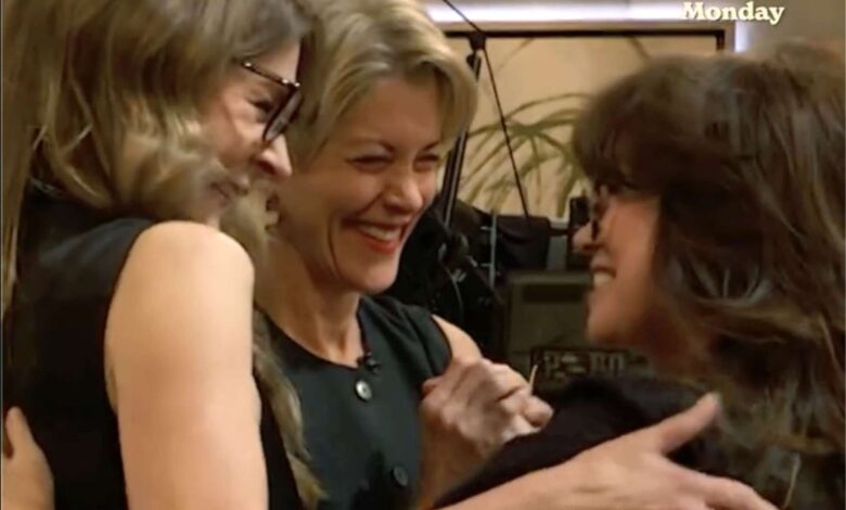 Пре Барриморе чак и завршава, Бертинелли скаче на ноге, вришти, пљескавши и растурајући се као њене бивше кораке Леевес, 64 и Малицк, 74, изађите. Бертинелли јури низ пролаз да би се упознала и Трио загрљај.