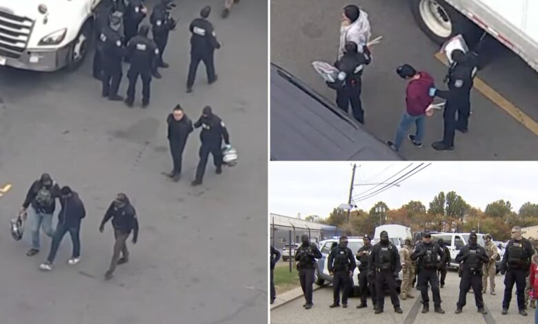 Снимци надзора забележили су напете тренутке док су савезни службеници пратили групе радника у оно што је изгледало као да су били бројни комбији који чекају док је складиште било окружено великим присуством полиције током операције.