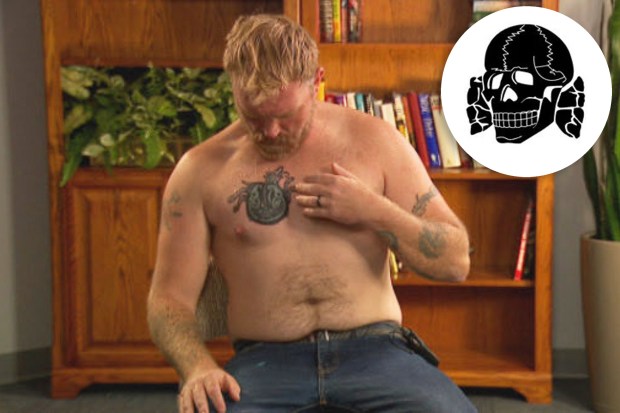 Кандидат за Сенат Грејем Платнер указује на прикривену тетоважу која је претходно била нацистичка слика лобање ‘тотенкопф’ (уметак), током интервјуа 22. октобра у Портланду, у држави Мејн. (ВГМЕ преко АП; АДЛ)