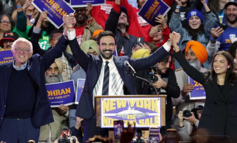 Новоизабрани градоначелник Њујорка Зохран Мамдани држи се за руке са сенатором Бернијем Сандерсом и послаником Александријом Окасио-Кортез на предизборном скупу у октобру. Сва тројица се идентификују као демократски социјалисти.