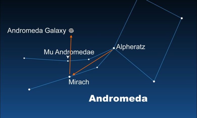 Затим идите на другу звезду нагоре на сваком стримеру: Мирацх и Му Андромедае (скраћено Му на карти неба). Након тога, нацртајте замишљену линију од Мирача кроз Му, идући двоструко више од удаљености Мирацх/Му. Управо сте слетели на галаксију Андромеда!