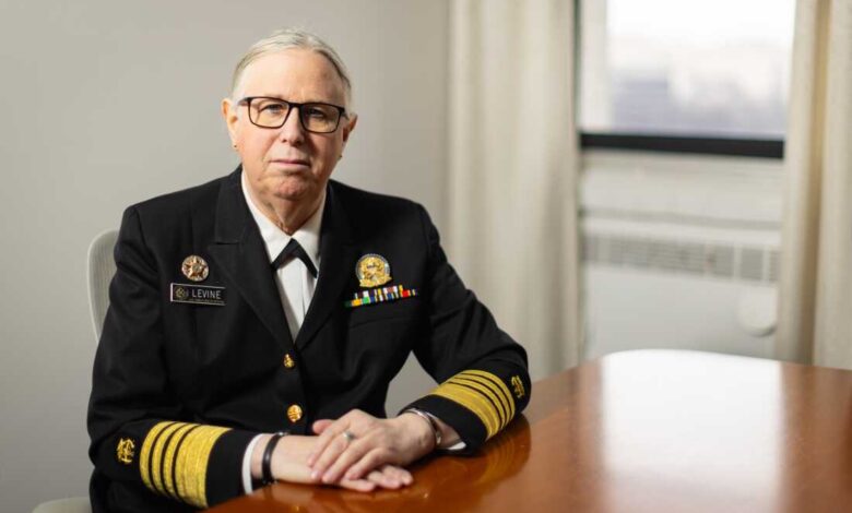 Адмирал Рејчел Л. Левин, на слици у седишту ХХС прошле године, водила је корпус за јавно здравље током Бајденове администрације. Њен званични портрет је промењен током затварања владе у њено претходно име.