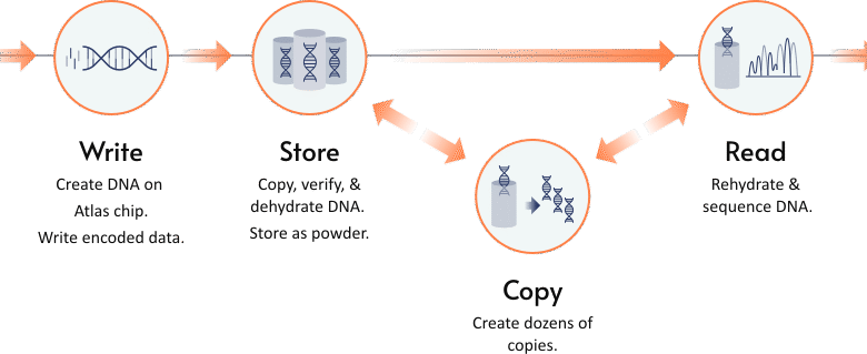 За Атлас Еон 100, ДНК се затим дехидрира и чува као прах у 0,7 инча високим (1,8 цм) чврстим челичним капсулама. Рехидрира се само када треба да се секвенцира и његове базе преведу назад у бинарни.