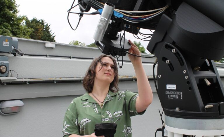 Царис Херберт прегледава телескоп који се користи у пројектима грађана и науке на Светионику Светиона Свеучилишта у Центону у Цантербурију, у Великој Британији – док она такође скенира хоризонт за стални положај за стални положај након њеног доктората. КРЕДИТ: Универзитет у Кент-у