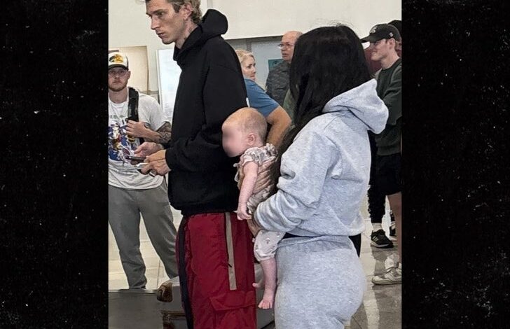 Мгк и Меган су и носе дуксеве са капуљачом … Његово је црно и њено је сиво … и она држи своје дете у наручју. Морам удобно путовати, посебно када су деца укључена на међународно путовање.